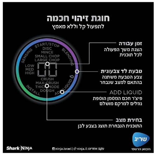 תוכניות לבחירה: טחינה MINCE | קיצוץ דק SMALL CHOP| קיצוץ גס LARGE CHOP | ריסוק CRUSH| ריסוק מקסימלי MAX CRUSH| מצב סמיך THICK MODE | בצק DOUGH