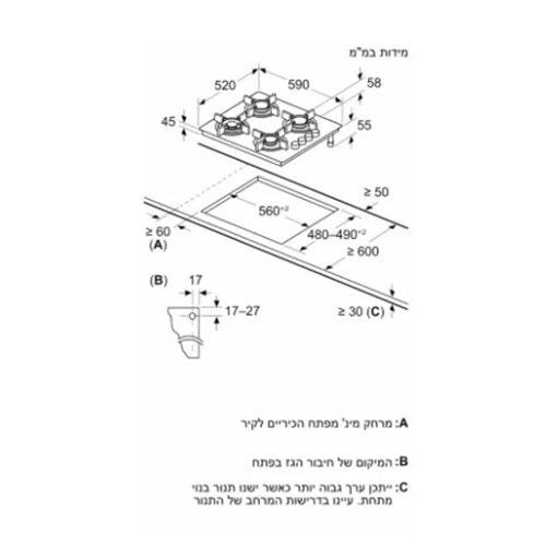 כיריים גז 4 להבות 60 ס"מ BOSCH POH6B6K30Y זכוכית - מידע נוסף