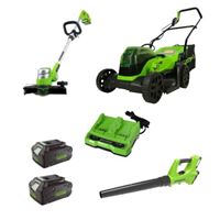 סט גינון מכסחת דשא + חרמש + מפוח עלים GREENWORKS