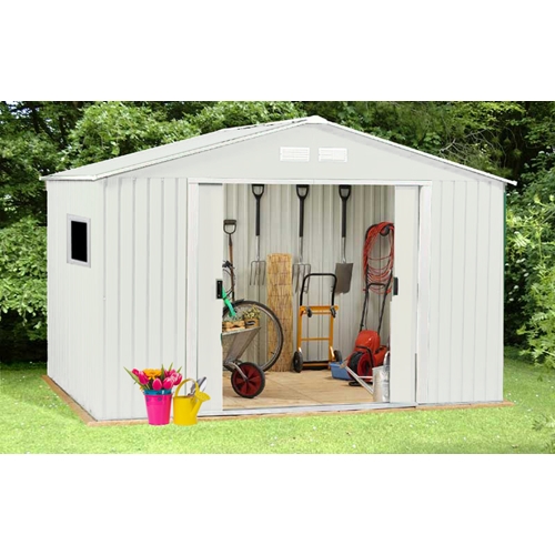 למחסני המתכת מבית Garden Top זוג דלתות הזזה על מסילה פנימית ו-4 פתחי אוורור ובעלי חלון ייחודי.
