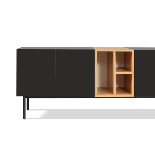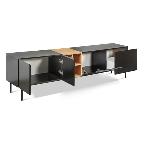 מזנון עיצובי מיוחד הכולל, מגירה, קלאפה, יחידת מדפי עץ וחלל אחסון ענקי עם 2 דלתות.