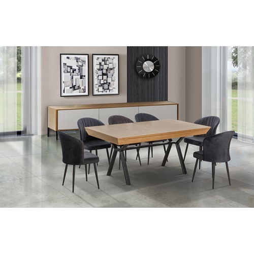שולחן פינת אוכל מלבני יוקרתי. המסגרת שלו עשויה מעץ, הפלטה העליונה עשויה מפורניר והרגליים שלו עשויות מברזל שחור.