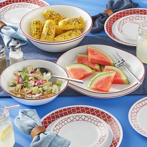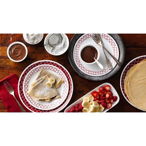 סט הצלחות של קורל מדגם קרימסון טרליס משלב את אותה הדוגמא בצבעוניות הפוכה, בין המנה העיקרית לראשונה.