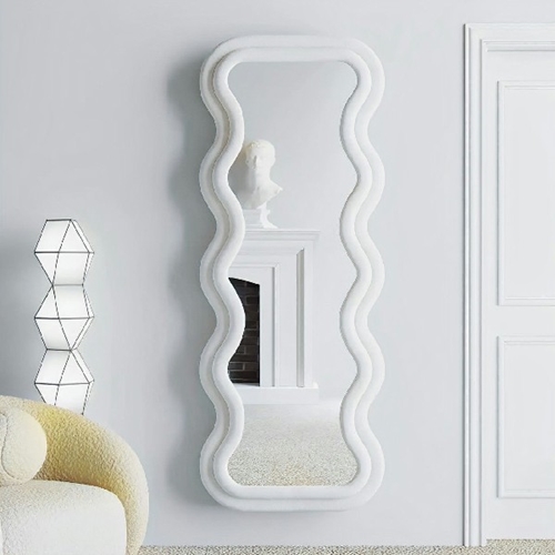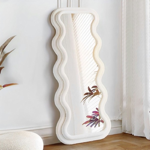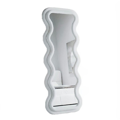 - מראה אמורפית במסגרת קטיפה מסגרת בעיצוב גלי בגוון לבן