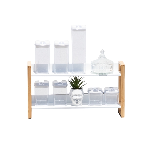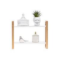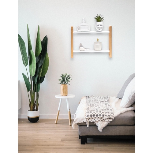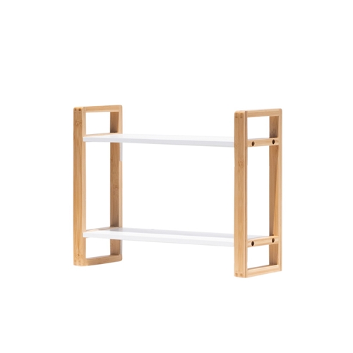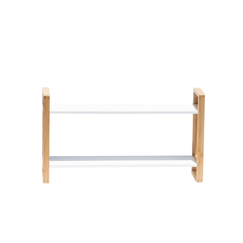 בעל שני מדפים לאחסון ושני מסגרות עץ התומכות בצדדי המדפים.