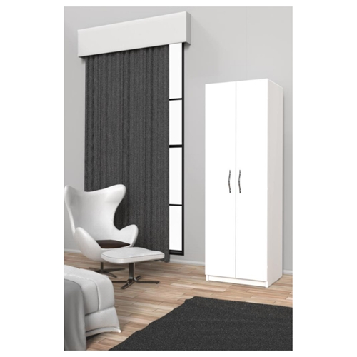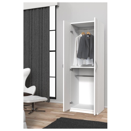 יש לו שני דלתות מחולקות וחלוקה פנימית המכילה מדף אמצעי ואפשרויות תליות חלק עליון ותחתון.