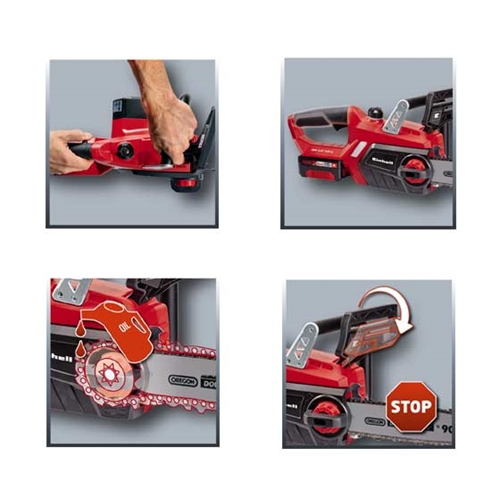 המסור האלחוטי של איינהל בטוח וקל לשימוש ברחבי הגינה. הגנה מפני שיבושים ובלם שרשרת מכני בתגובה מיידית מגנים עליך בזמן שאתה עובד עם המסור.