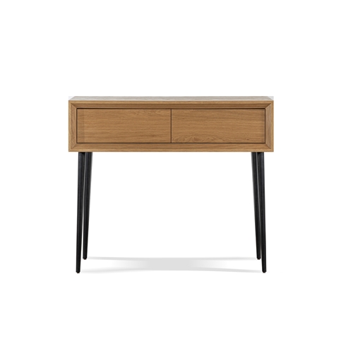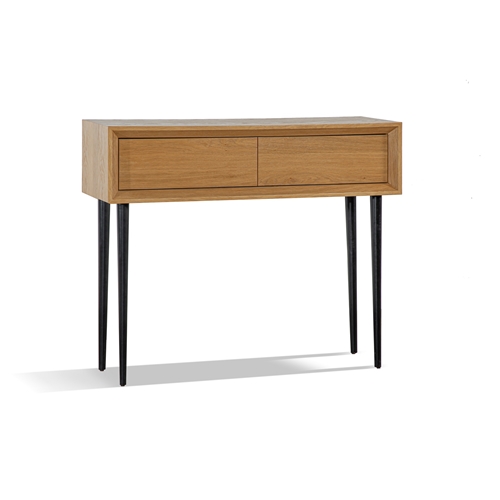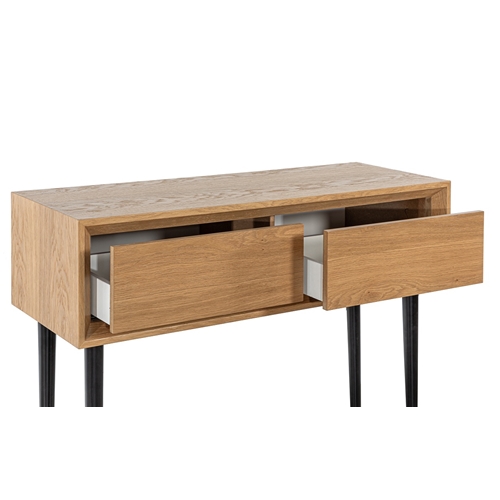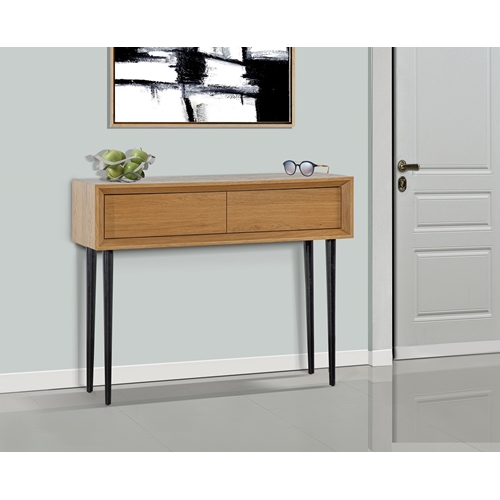 הקונסולה עשויה MDF חזק מצופה פורניר בגוון עץ ורגלי ברזל חזקות ויציבות. שתי מגירות.