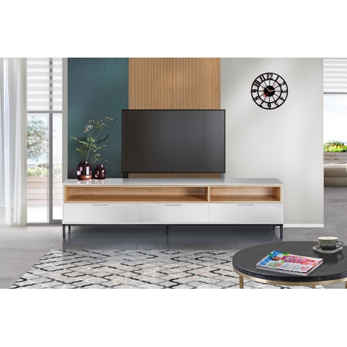 מזנון עיצובי מיוחד הכולל 3 מגירות ו-2 יחידות חללי עץ. המזנון עשוי עץ תעשייתי ורגלי ברזל.