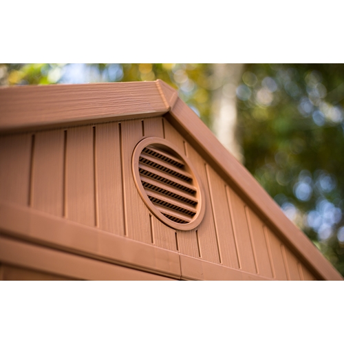 מחסן גינה דמוי עץ מיוצר עם טכנולוגיה מתקדמת למראה עץ טבעי.