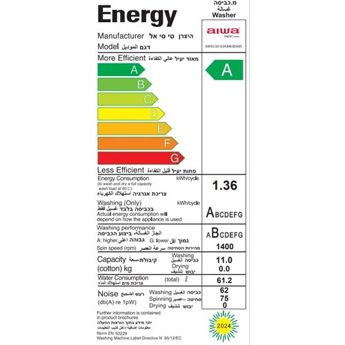 מכונת כביסה 11 ק"ג דגם Aiwa AWG110-G143063DA05 לבן - מידע נוסף