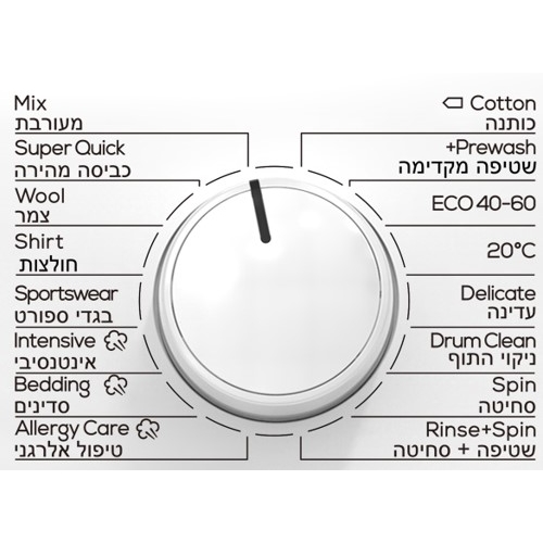 תוכניות הפעלה : כותנה, שטיפה מקדימה, ECO 40-60, תוכנית 20 מעלות, תוכנית עדינה, סחיטה, שטיפה + סחיטה, מעורבת,