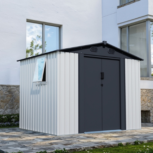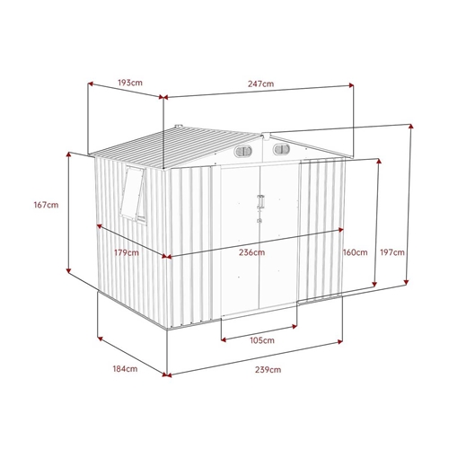 למחסני המתכת מבית Garden Top זוג דלתות הזזה על מסילה פנימית ו-4 פתחי אוורור ובעלי חלון ייחודי.