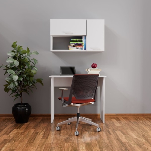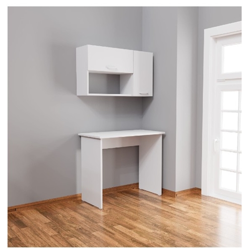 התמונה מציגה סט של שולחן עבודה משרדי ליווי עם ספריה תלויה, שניהם בעיצוב מינימליסטי, בצבע לבן.