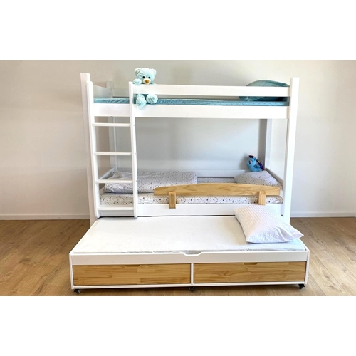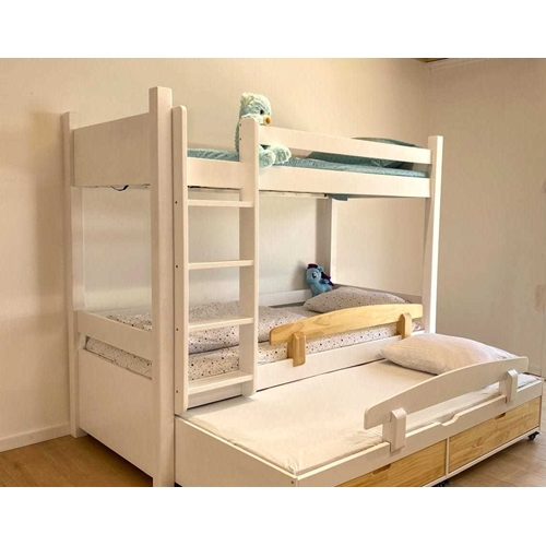 כולל: מיטת קומותיים: מיטה יחיד עליונה, מיטה יחיד תחתונה, מיטה נגררת, זוג מגירות אחסון, סולם ומעקה נשלף.