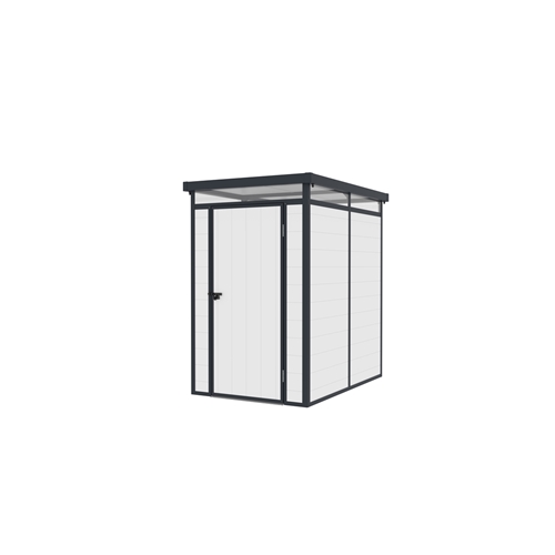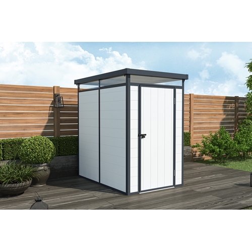 מחסן פלסטיק עמיד עם גג סקייליט בחלקו העליון.