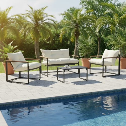 פינת הישיבה כוללת ספה דו מושבית + שתי כורסאות יחיד + שולחן אירוח מלבני וכריות מרופדות בגוון שמנת