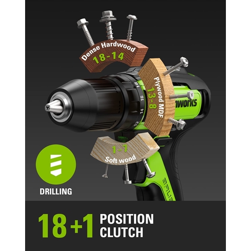 גיר 18+1 ושתי מהירויות משתנות מאפשר שליטה מדויקת בקידוח חורים והידוק במגוון חומרים.