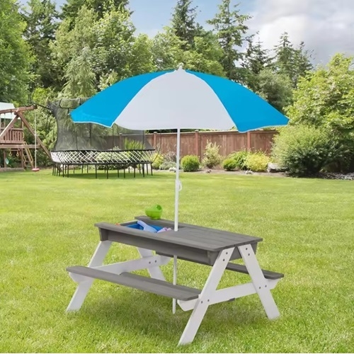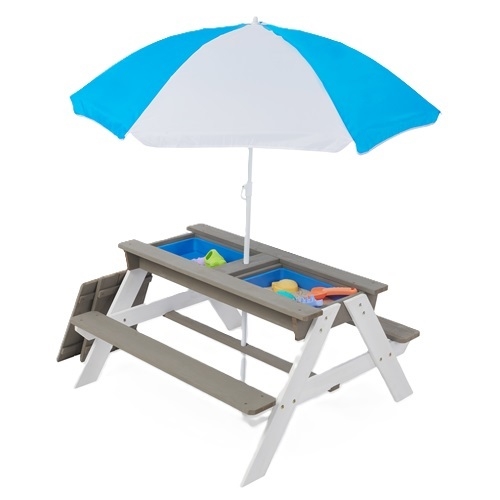 שולחן פיקניק לילדים בשילוב עץ לבן ואפור עם שמשיה