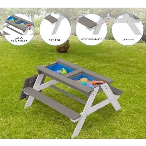 עיצוב מיוחד: שולחן מעוצב עם שתי קופסאות משחק על השולחן עבור משחקי חול ומים , ניתן להמיר אותו לשולחן פיקניק על כיסוי השולחן עם משטחי השולחן