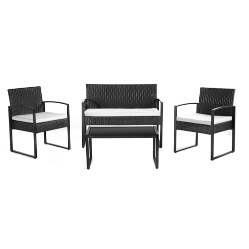 פינת הישיבה כוללת כוללת ספה דו מושבית + שתי כורסאות יחיד + שולחן אירוח מלבני וכריות מרופדות בגוון שחור