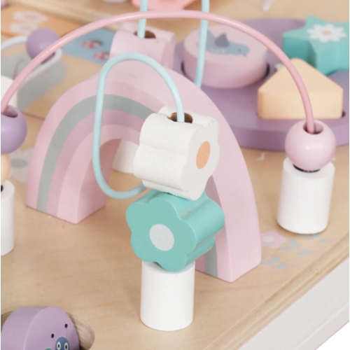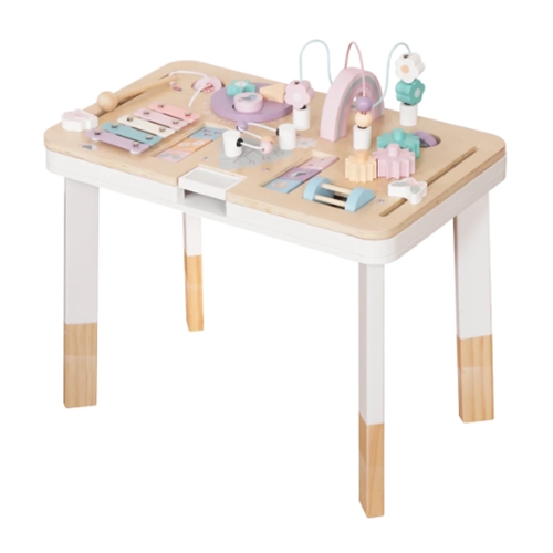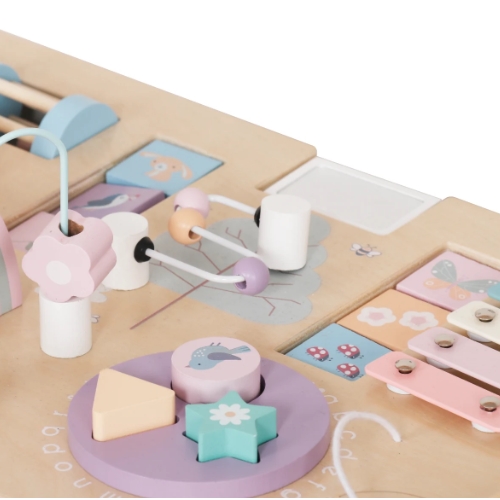 השולחן כולל חרוזים, סדרן הצורות, קסילופון, לוח גירוד, סיבוב גלגלי שיניים, רעשן מסתובב ועוד