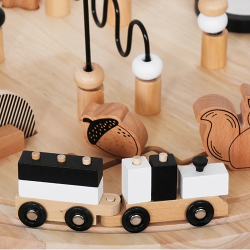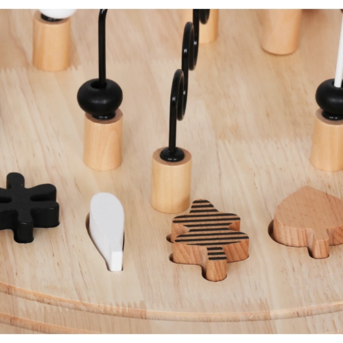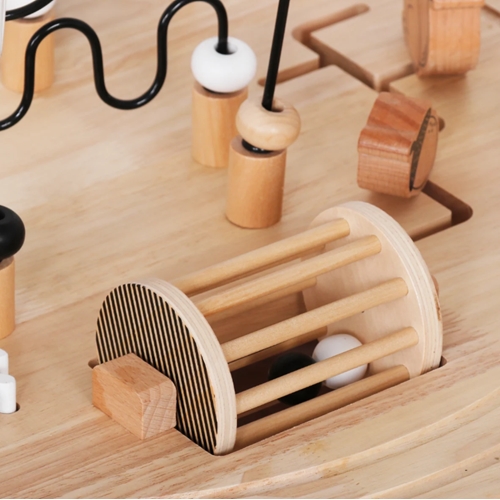 השולחן כולל חרוזים, סדרן הצורות, קסילופון, לוח גירוד, סיבוב גלגלי שיניים, רעשן מסתובב ועוד
