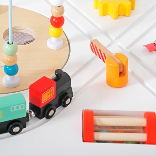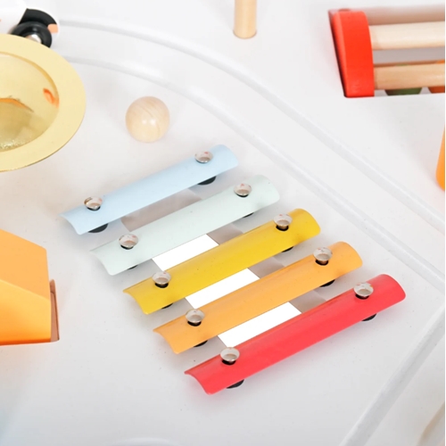 השולחן כולל חרוזים, סדרן הצורות, קסילופון, לוח גירוד, סיבוב גלגלי שיניים, רעשן מסתובב ועוד