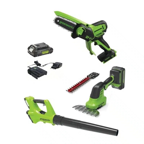 - סט גינון מושלם מסור שרשרת + מפוח + מגזמת שיחים GREENWORKS