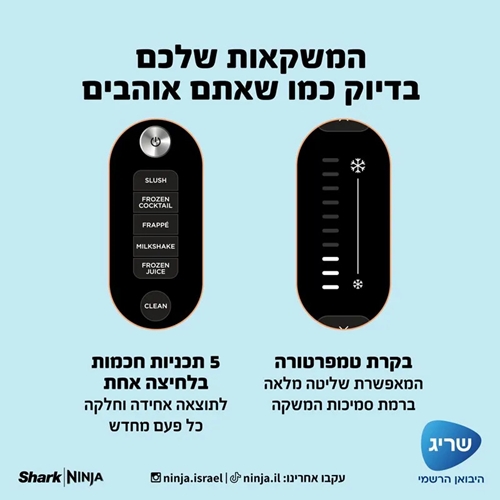 שליטה בטמפרטורה: המאפשרת להתאים את רמת סמיכות המשקה הקפוא בדיוק כמו שאתם אוהבים.