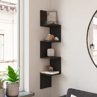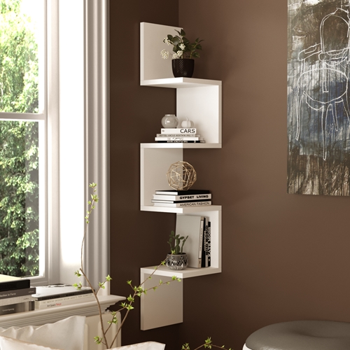 יחידת מדפים פינתית המונה 4 מדפים קטנים בעיצוב אסימטרי.