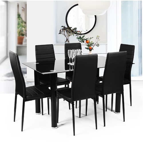 פינת אוכל בעיצוב מודרני הכוללת שולחן עשוי זכוכית מחוסמת במראה אלגנטי מיוחד ושישה כיסאות תואמים.