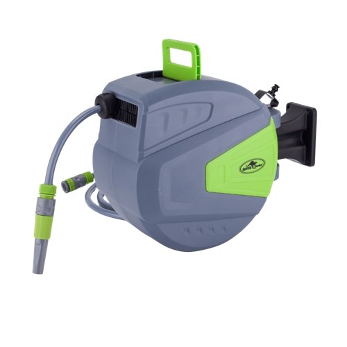 גלגלת השקיה קומפקטית עם חזרה מבוקרת, תושבת קיר מסתובבת 180°, עצירה אוטומטית והגנה מקרני UV. אידיאלית לגינה או למרפסת.