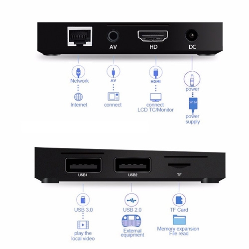 2 כניסות USB, יציאת אודיו SPDIF, חיבור וידיאו HDMI בתקן b1.4 CEC, תמיכה ב WIFI, LAN, ובלוטות' מובנים. KODI מותקן מראש. תמיכה ב H.264 ו H.265