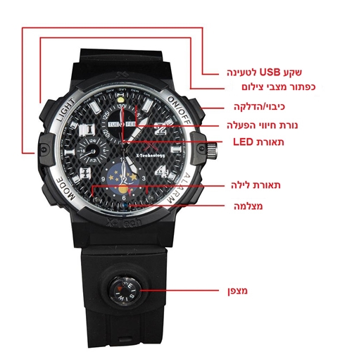 - שעון ספורט מעוצב בשילוב עם מצלמה מובנית ומיקרופון רגיש, לצרכי אבטחה, תיעוד פגישות ועוד כולל חיבור אלחוטי לטלפון סלולארי .
