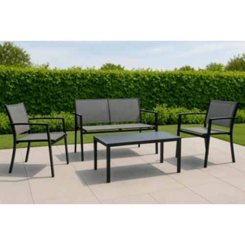 מערכת ישיבה לגינה בעיצוב חדשני הכוללת 2 כיסאות יחיד וכיסא זוגי אחד עם שולחן מזכוכית מחוסמת בעובי 5 מ"מ עמידה ואסתטית