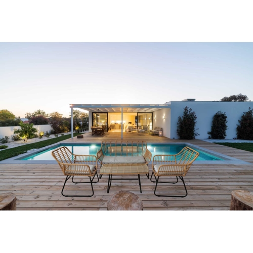 פינת ישיבה מפנקת בעיצוב מודרני משילדת ברזל בשילוב ראטן למראה יוקרתי.