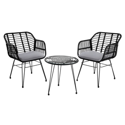 פינת ישיבה זוגית בעיצוב מודרני, עם שילדת ברזל עמידה בשילוב ראטן בצבע שחור, למראה יוקרתי ומעוצב.