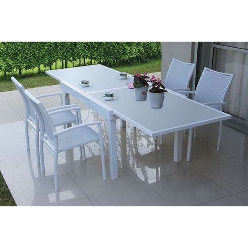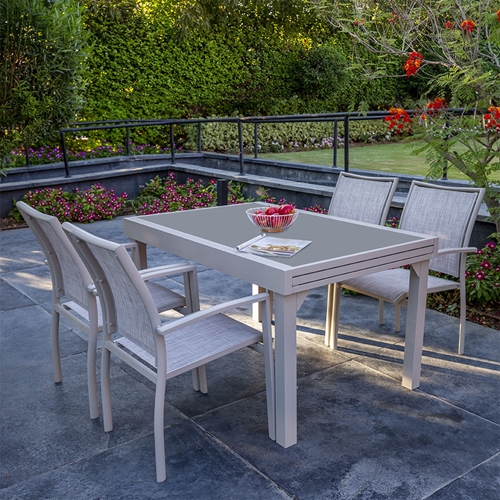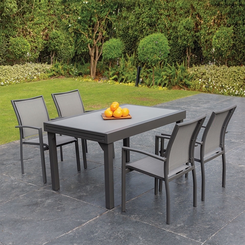 מערכת גן הכוללת שולחן ו-4 כיסאות אלומיניום בשילוב בד טקסטליין רחיץ ועמיד.