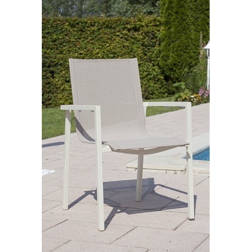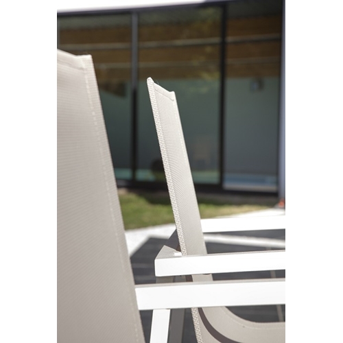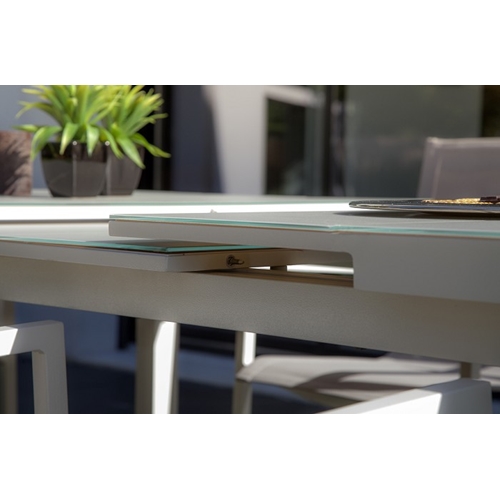 מערכת גן הכוללת שולחן משילדת אלומיניום בשילוב זכוכית מחוסמת ו-4 כיסאות אלומיניום בשילוב בד טקסטליין