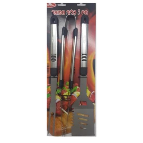 סט 3 כלים מפואר לגריל עם ידיות נירוסטה הסט מכיל בתוכו מזלג לבשר,