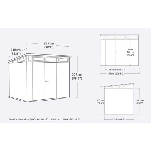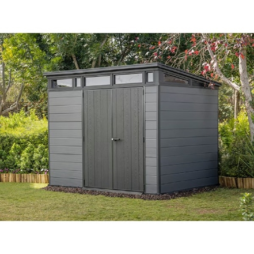 מחסן גינה קורטינה 9x7 בעיצוב מתקדם ועכשווי, פתרון אחסון יעיל ונוח מבלי להתפשר על העיצוב.