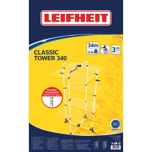 - מתקן ייבוש כביסה מגדל 340 Classic Tower יציב מאוד מתאים להצבה במקלחת, חסכוני במקום רק 69/73 ס"מ, 34 מטר לתלייה כ-3.5 מכונות כביסה, מגיע עם גלגלים 360 מעלות,לא מחליד, 3 שנים אחריות, 146/69/73 סמ