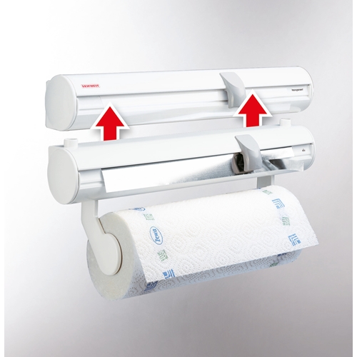 - דיספנסר למטבח מתקן משולב לגלילים ROLLY MOBIL FAM עם סכיני חיתוך אינטגרלים מכיל נייר ניגוב, רדיד אלומיניום, נילון נצמד, תא עליון נשלף, צבע לבן 3 שנים אחריות