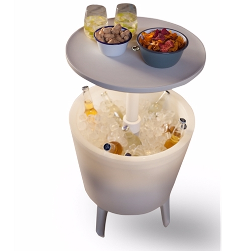 שולחן קוקטיילים טרנדי משולב בצידנית גדולה, ומתאים במיוחד לארוחות על האש או לערבים נעימים בגינה.