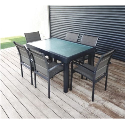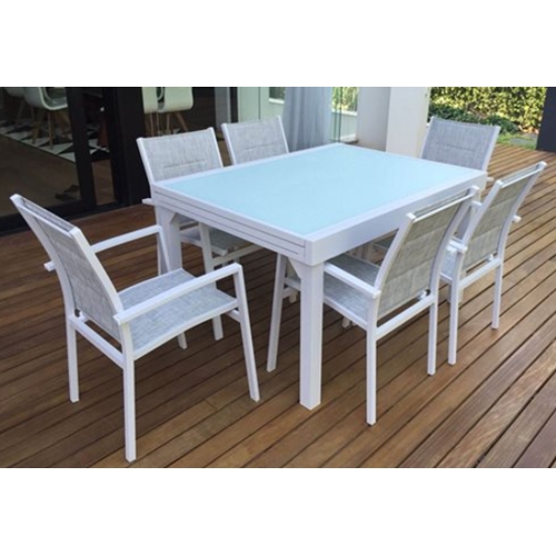- שולחן חוץ העשוי ממבנה אלומיניום בשילוב פלטה זכוכית מחוסמת.