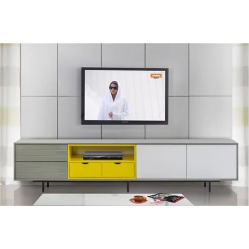 מזנון לסלון עשוי משילוב של עץ וMDF ובצביעה מיוחדת בשילוב צבעי לבן, אפור וצהוב.