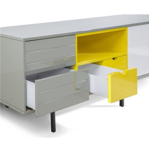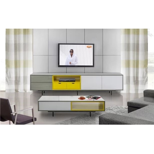 מערכת עשויה משילוב של עץ + MDF ובצביעה מיוחדת בשילוב צבעי לבן, אפור וצהוב.