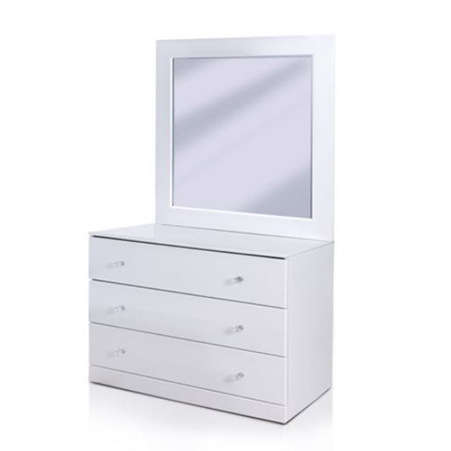 כך גם הקומודה, שהיא קומודה גבוהה שכוללת שלוש מגירות. המראה הינה גדולה ובעלת מסגרת לבנה מבריקה.