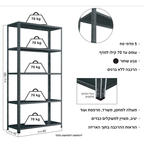 - סט 5 מדפים צבע שחור מפח לעומס 70 ק"ג למדף Metalkas מבית AUSTRALIA HOME
